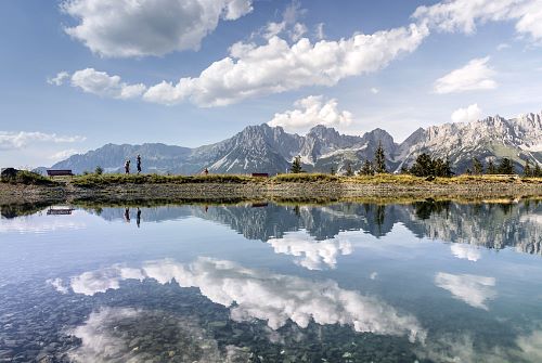 The Astbergsee is in a tranquil location, surrounded by mountains and with the impressive mountain massif of the Wilder Kaiser in the background. Astbergsee glistening in the sun. On very clear days the silhouette of the Wilder Kaiser is reflected on the surface of the lake.